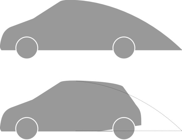 But priorities have since changed. Perhaps as a result of growing concern about energy consumption and greenhouse gas emissions, manufacturers have revised the profile in subtle ways to reduce air resistance without compromising other requirements. The way to do it is not to make the car look like an aircraft. Although the same principles apply to both, in practice the drag comes from different sources and therefore cars and planes call for different types of aerodynamic treatment [2]. In the case of aircraft, there is almost no separation of the boundary layer so a high proportion of the drag comes from surface friction. In the case of an automobile it’s the other way round: the key is to eliminate or postpone separation and to minimise the cross-sectional area of the wake. Wind tunnel research has shown that the effects of quite small alterations, applied consistently to all parts of the vehicle body, can together produce a large drag reduction. Starting during the mid 1980s, a systematic approach along these lines resulted in several production models with a drag coefficient of about 0.3. One of the first to go into production was the 1982 Audi 100 [21]. The modifications can be broken down into three main areas: front end, rear end, and underbody plus engine compartment.