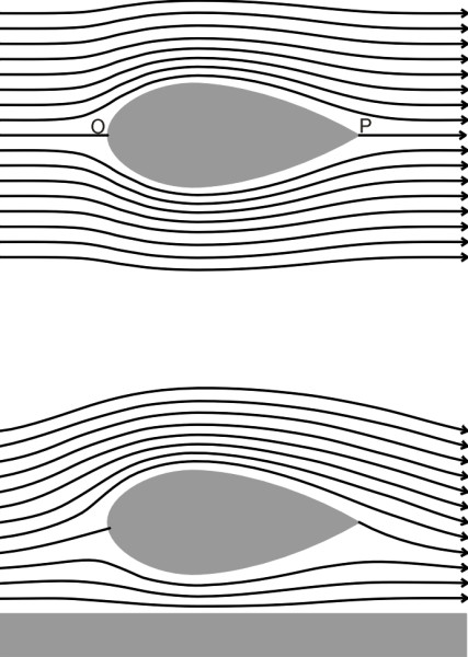 So can we apply zeppelin shape to build a really efficient automobile? The zeppelin has a low drag coefficient, but the long tail presents a problem and the cylindrical cross-section is not very convenient. And there is another complication. For minimum drag, a zeppelin must be flying well clear of the ground so the air can flow freely underneath as well as round the sides and over the top. In the case of an automobile, whatever its shape, the presence of the road surface profoundly changes the flow pattern. Imagine a miniature airship of roughly the same height and length as a family saloon, in other words, its length is equal to roughly three times its diameter, as shown in the upper part of figure 20. Because its shape is symmetrical, the pattern of streamlines must be symmetrical too, and if we imagine a horizontal plane slicing through the nose and tail (points O and P in figure 20), the proportion of air flowing over the top of the airship above this plane must be the same as the proportion flowing underneath. As the zeppelin descends towards the ground, the flow of air underneath is partly obstructed, and most of the streamlines curve upwards and arch over the top. Effectively it becomes a different shape having a larger drag coefficient [43].