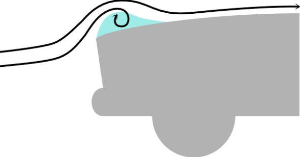 - A second location is the base of the windshield, then over the top of the windshield at the leading edge of the roof. Separation can also arise round both sides of the windshield to form trailing vortices that extend rearward into the wake from the A-pillars as shown in figure 18.