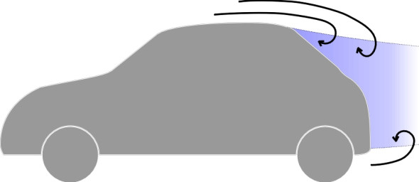 - Turning to the rear of the vehicle we observe the third and most dramatic feature for a modern saloon: the two trailing vortices formed on either side of the rear pillars together with a turbulent wake of across the whole rear of the car (figure 19). Inside the wake, the air pressure is lower than the pressure acting on the front of the car, and the resulting pressure difference is responsible for a major proportion of the overall drag.