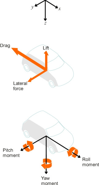 To summarise, we observe an array of shear and normal pressure forces acting on the vehicle body surface. Their overall effect can be pictured as having two main components: drag, which acts against the direction of motion, and lift, which acts upwards, at right-angles to the direction of motion. There may also be a net lateral force if the shape of the body is not symmetrical or if the air flow is not parallel to its longitudinal axis, and there are potentially three aerodynamic moments that tend to make the vehicle rotate (figure 13). The convention is to regard all the forces as acting at road surface level halfway between the front and rear axle on the vehicle centreline.