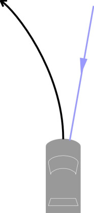 Here, we’ll concentrate on stability. Analysts usually divide the de-stabilising effect of a crosswind into two distinct components. Firstly, it creates a lateral force that can be pictured as acting at a single point - the centre of lateral pressure. This force will push the vehicle sideways across the road to a greater a lesser amount depending on the tyre slip angle. Secondly, unless the side force acts at the neutral steer point (see Section C0418), it will also make the vehicle rotate or yaw. There are differing views about the preferred direction of yaw. One might want the vehicle to turn into the wind like a weathercock so that it steers itself automatically, as it were, back towards its original path. Unfortunately, for most saloon cars the side force acts at a point well forward of the neutral steer point, about one third of the car’s length from the front [18]. Hence the car will rotate or yaw away from the direction of the wind (figure 27), thereby accentuating the crabwise deviation. The yaw moment is therefore considered by designers as potentially more dangerous than the side force itself [19] [27]. Moreover, many cars have a built-in front wheel castor such that any lateral force at the centre of the contact patch tends to swivel the front wheels about the kingpin axis in a manner that exacerbates the effect.