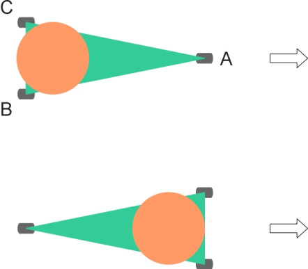 Now let us try to fit the stability cone within some alternative wheel plans. Some options are shown in figure 14. The rectangle at the top represents a conventional car with a wheel at each of its four corners. Below is a diamond layout with a single wheel in front, a single wheel behind, and two wheels arranged amidships. At the bottom is the more familiar three-wheeler, with a single wheel at the front. One can see that the rectangular envelope encloses a larger disc than a diamond envelope of the same overall width. In other words, the car with the rectangular layout can survive greater friction forces without overturning. So we can rule out the diamond layout. Note also that the rectangular layout cannot be improved by increasing the number of wheels to six or eight, say. Assuming that the overall width is constrained by width of a typical parking space, adding more wheels doesn’t change the envelope.