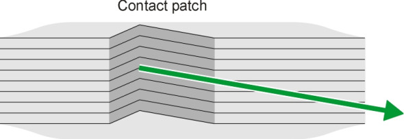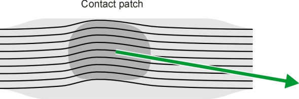 The angular difference between the direction of motion and the direction in which the wheel is pointing is known as the tyre slip angle. The phenomenon was first studied in France during the 1920’s [21]. The term ‘slip angle’ is really a misnomer [20], because the tyre doesn’t actually slip across the road surface. What happens is a combination of creep and distortion. Creep is the flow of the tread over asperities in the road surface on an almost microscopic scale. The distortion is a larger-scale sideways deformation of the tread in plan as it passes through the contact patch. For simplicity, the distortion is often pictured as shown in figure 9, with each element of rubber snaking through a zig-zag pattern (see for example [11]). In practice, the tread of a modern radial tyre is made as stiff as possible in the lateral direction, and as figure 10 shows, the trajectory follows a somewhat smoother curve that has been described as a ‘semi-banana’ [18].