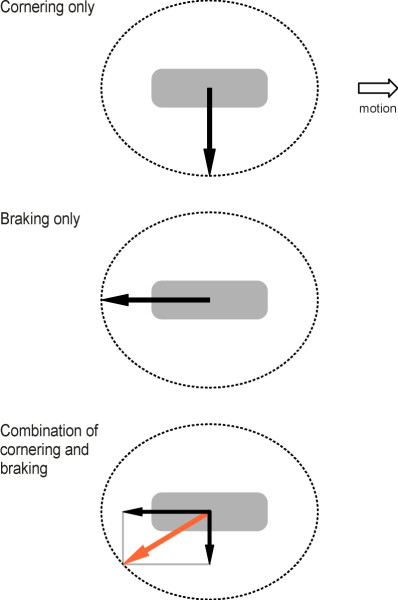Most tyres have roughly equal grip in all directions [16] [22], but some have less grip laterally than longitudinally. In general, if we plot the maximum value available in each direction on a diagram, we find that the points lie roughly on an ellipse centred on the contact patch as shown in figure 7. The diagram reveals something that experienced drivers know instinctively, that lateral and longitudinal grip are not independent: the total grip must be shared between them. For example, you cannot brake on a curve as hard as you might if you were travelling in a straight line because the resultant force overshoots the boundary of the ellipse. Likewise, you cannot swerve as sharply while braking as you would with your foot lifted off the brake pedal.