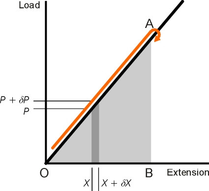 Now let’s go back to the original loading cycle. Any change in extension involves a flow of energy. During the first part of the cycle, the load is increasing (figure 3). Over any small segment of the curve, if it increases from \(P\) to \(P + \delta P\) while the extension increases from \(X\) to \(X + \delta X\), the energy put into the spring is equal to the force times distance moved, or \(P \delta X\). This increment of energy is represented by the dark grey area under the curve in figure 3, and the total energy put in during the loading process is the area of the triangle OAB. When you relax the tension in the spring, the energy flows back into your arm. Since the graph follows the same straight line back to the origin, the energy recovered is also the area under the triangle OAB. Therefore, the energy you put into stretching a steel spring is recovered when the spring is relaxed.