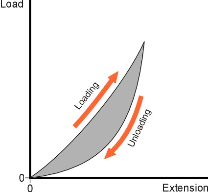 Where does the energy go? Let’s look at a ‘normal’ material first. When you pull on a steel spring, it will stretch. Denote the increase in length, the extension, by \(X\). With zero load, there is no extension (\(X = 0\)). As the load increases, the extension grows in direct proportion, the relationship following a straight line provided that the load is not too large. Let’s take it up to a target load of \(T\) kN say. Now relax the tension, but gradually. The length of the spring will fall, tracing out the original line in reverse. Crucially, the load corresponding to any particular extension is always the same, regardless of whether we are increasing the load or reducing it. In other words, the load/extension curve is identical for the two parts of the loading cycle (figure 2). In fact, we can go further. For any particular stress level, the strain will always be the same, so we could load the specimen up to twice the target value and then reduce it by 40% say, then stop for a few minutes (or years) before continuing down the target level \(T\). For a truly elastic material, the loading sequence is irrelevant.