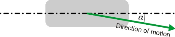 You might expect a car wheel to go where it is pointing, with its path mapped out precisely along the road as if running on a railway track. Indeed, when rolling very slowly, an upright wheel will do just that, without deviating from side to side. It has intrinsic lateral stiffness. But this stiffness falls rapidly above walking pace, becoming negligible at 20 km/h (12 mph), when a side wind will push it off course, albeit at a small angle [1]. The deviation doesn’t begin straight away, but after a short lag. The lag amounts to less than a single wheel revolution, a distance called the relaxation length [12]. In fact, in order to resist a lateral force, a tyre must point at an angle to the direction in which you want it to go (figure 8). Denoted by \(\alpha\), this angle rarely exceeds 1\(^\circ\) in normal driving, but under extreme conditions of maximum side force in a swerve it can reach 20\(^\circ\) [2]. The effect is most noticeable on the racetrack, where on high-speed corners, not only the front wheels but the whole body of a racing saloon will slewed dramatically at an angle to the direction of motion.