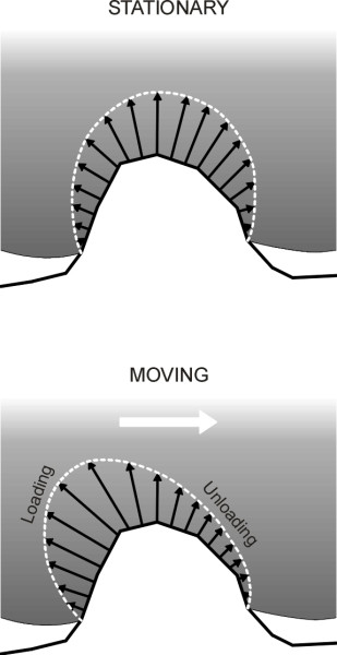 But if the vehicle is moving and the driver puts on the brakes, the inertia of the vehicle will tend to drag the tread along the road surface. You might expect this to result in increased compression along the upstream side of each peak, and reduced compression on the downstream side, by analogy with the ‘sawtooth’ model described in Section G2016. Indeed this is what happens, but there is a crucial difference: continuous deformation of the rubber surface. It is creeping along the road. As it passes over a peak, each element of rubber in the tread undergoes firstly a loading process and then an unloading process [3] [27]. The increase in pressure during the loading process is greater than the decrease during the unloading process, and the result is a net resistance (lower diagram in figure 5).