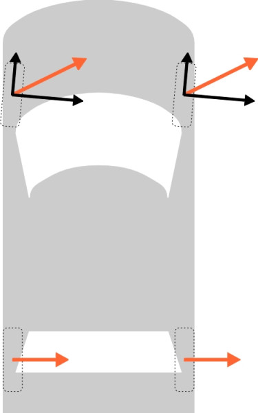 Shear forces occur in pairs – the action and reaction are equal and opposite. If the table supplies a shear force that prevents the plate from moving when disturbed, the plate must at the same time exert an equal and opposite shear force on the table. A shear force can be represented diagrammatically in the form of an arrow with half of the arrowhead missing, as shown in the upper part of figure 1. Here, we see a tyre tread resting on the road surface. But the while a tea plate is rigid, the tyre tread is not. It drapes itself over each ‘asperity’ or projecting stone chip in the road surface, generating friction wherever there is contact. In figure 1, the tyre is moving from left to right, and the driver has applied the brakes, so that the tread exerts a shear force around the perimeter of the asperity (white arrows), and in return is acted upon by a complementary shear force that tends to slow down the tread (orange arrows).