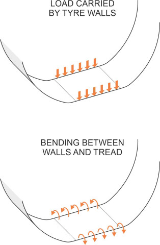 We mentioned earlier that to a first approximation, the carcass of a tyre acts like the skin of a balloon, and we might expect the pressure within the contact patch between the tyre and the road beneath to be roughly uniform. However, reality turns out to be more complicated. To begin with, the carcass acts to some degree as a load-bearing structure in its own right and therefore the tyre walls carry a proportion of the load directly to the ground via the shoulders - about 5% (figure 9). As a result, the pressure distribution within the contact patch is not uniform: the load carried by the tyre wall appears as a band of raised pressure along either side of the contact area, whose value is augmented by pressure arising from abrupt bending of the tread and walls (figure 10). Hence the pressure within the central part of the contact patch is a little less than one might otherwise expect. Using pressure sensors and a laboratory rig, it is possible to measure and plot these pressure variations in the form of contours. Examples of contour plots for stationary tyres can be found in [3], [6] and [9].