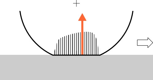 But the pattern changes when the wheel starts to roll: the centre of pressure moves forward of the axle centreline as shown in figure 11. It does so because the material is not strictly elastic. As we shall see later in Section C1717, each sector of the carcass undergoes a loading/unloading cycle as it passes through the contact patch, with the contact pressure higher during the loading part than it is during the unloading part owing to hysteresis in the rubber matrix. There is nothing mysterious about this: as explained in Section G1619, viscoelastic solids tend to absorb energy that is put into them when they are squeezed or stretched, energy that is not fully recovered when the load is removed.