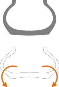 In order for the tyre contact area to lie flat on the road surface, the surrounding carcass must deform. Before going any further, it will be helpful to look at the nature of this deformation to see how it might affect the relationship between the tyre and the road. The most obvious deformation occurs in the walls, which bulge out on either side (figure 3). Repeated distortion of the tyre wall as the wheel rotates tends to overheat the carcass unless the wall is thin and flexible as is normally the case with radial tyres. However, even a thin wall resists bending to some extent, and in the process of deformation the wall transmits to the tyre tread within the contact patch a bending moment that tends to rotate the shoulder outwards as shown in figure 3. This is one of the reasons why the normal pressure distribution of the tyre on the road is not uniform.