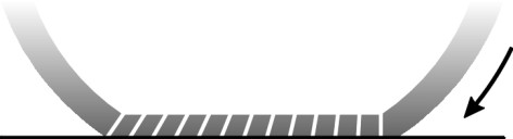 Imagine a car being driven along a straight, level road. The driver applies the brakes, gently at first then with increasing pressure on the brake pedal. We know that the shear stress within any element of the tyre tread rises as it moves along the contact patch, starting from zero at the leading edge. When the driver presses harder on the brake pedal, the shear stress at the trailing edge will eventually reach a limiting value determined by the coefficient of friction of the rubber tread with the road. When this happens, the tread is no longer ‘locked’ to the road surface at the trailing edge, but free to slide rather than creep over the road surface. It still provides a braking effect, but no directional guidance. Any further pressure on the brake pedal has no effect on the shear stress; instead, the area over which slip occurs extends forward to cover a larger proportion of the contact patch. At the same time, within the leading part of the contact patch the tread is still locked to the road, so the rear portion cannot slide independently in some other direction, and there will be no outward sign of movement. As shown in figure 15, the two parts of the contact patch exist simultaneously in two different states of friction, one slipping and the other locked. (Interestingly, much the same happens when the driver applies the brakes of a railway train: as will be described in Section R2019, the contact patch divides into two zones, with the ‘slip’ region at the rear and the ‘stick’ region at the front - it is a universal characteristic of a rolling wheel for the contact area to divide into two sectors in this way.)