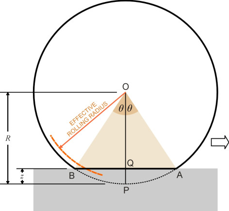 If the tyre were made from a rigid material like glass, then relative to the vehicle each point on the periphery would move through the contact patch at a speed equal to the rate of rotation multiplied by the radius. So instead of measuring the radius directly we could measure the speed \(V\) of the vehicle together with the angular rate of rotation \(\Omega\), and deduce the radius as \(V/\Omega\). For a flexible tyre, therefore, it makes sense to define the effective rolling radius as