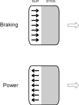 As the intensity of braking increases, the area of ‘slip’ continues to grow in size towards the leading edge of the contact patch, but there is still an area at the front that remains in normal rolling contact so that the wheel continues to provide lateral guidance (albeit reduced) and the car can be steered in a purposeful manner. However, the rate of creep within the ‘stick’ region now rises to a high level, and in fact the maximum friction occurs when the contact patch is creeping along the road at a speed around 10-20% of the speed of the car itself. At this point, the ‘slip’ area extends over the whole contact patch and any further increase in braking effort will cause the wheel to slide out of control.
