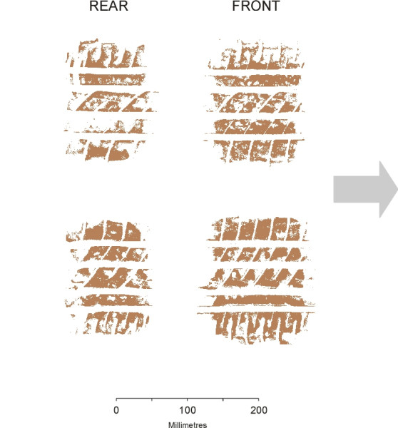 Pneumatic tyres are made in two different forms: radial ply and cross-ply (known as bias-ply in the USA - see Section C1610). Today, almost all cars use radial tyres; they deform in a different way from cross-ply tyres, and this is reflected in the shape of the contact patch. The outline is almost rectangular at normal loads, with rounded corners. If you jack up the wheel of your car you can make an image of the contact patch by inking the tyre and lowering the wheel onto a sheet of card backed with laminated chipboard. In figure 1, the prints of all four tyres of the author’s saloon are grouped together for comparison: the front axle of this car carries a little over 60% of the total weight, and this is reflected in the footprint sizes. Note that the dimensions change significantly when the vehicle is moving.