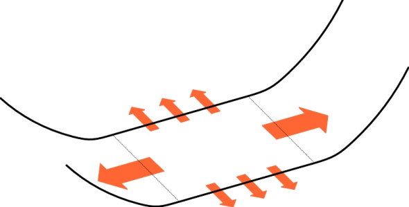 Less noticeable is a phenomenon that only occurs at higher speeds. When a tread element emerges from the contact patch there is a slight delay before it snaps back into its circular orbit, creating a longitudinal bulge outside the trailing edge (figure 5). This delay reflects the fact that a disturbance to the tread propagates at a finite speed around the tyre, in the same way that a wave travels at finite speed across a pond when you drop a stone in the water. Of course, the car wheel is rotating while the wave seems to stand still; hence it is referred to as a ‘standing wave’. It occurs most noticeably in cross-ply (bias-ply) tyres [4]. The wave travels at a fixed speed relative to the tyre, its value being determined by the tyre construction, ambient temperature and other factors. Let’s call it the ‘critical speed’. Clearly, when the car accelerates and the speed of the wheel increases, the tread will travel further round the wheel circumference before snapping back into its normal position. When the wheel speed approaches the critical speed, the wave will grow rapidly in size up to an amplitude of 10 mm and extend around a quarter of the tyre circumference [2]. At this point the wave absorbs a great deal of energy and the rolling resistance rises dramatically. When the wheel speed exceeds the critical value, by analogy with aerodynamics the wave becomes a shock wave, and the tyre is likely to disintegrate [5].