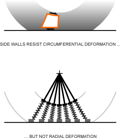 The reason is that the radius of any given tread element varies continuously as it moves through the contact patch. On entry at point A in figure 6 its radius is equal to the unloaded radius \(R\), but the value falls to \(R-z\) in the centre at Q, then rises to \(R\) again on exit at B. To predict the consequences, we must make some assumptions about the way each tread element is connected to its neighbours fore and aft, and also to the walls of the tyre on either side. One possibility is to treat it as a separate chunk of rubber that slides freely along a radial spoke that is rigidly attached to the wheel hub. We assume in effect that the tyre wall can flex to allow movement towards and away from the axle centreline, but being relatively stiff in shear it prevents circumferential movement altogether (figure 7).